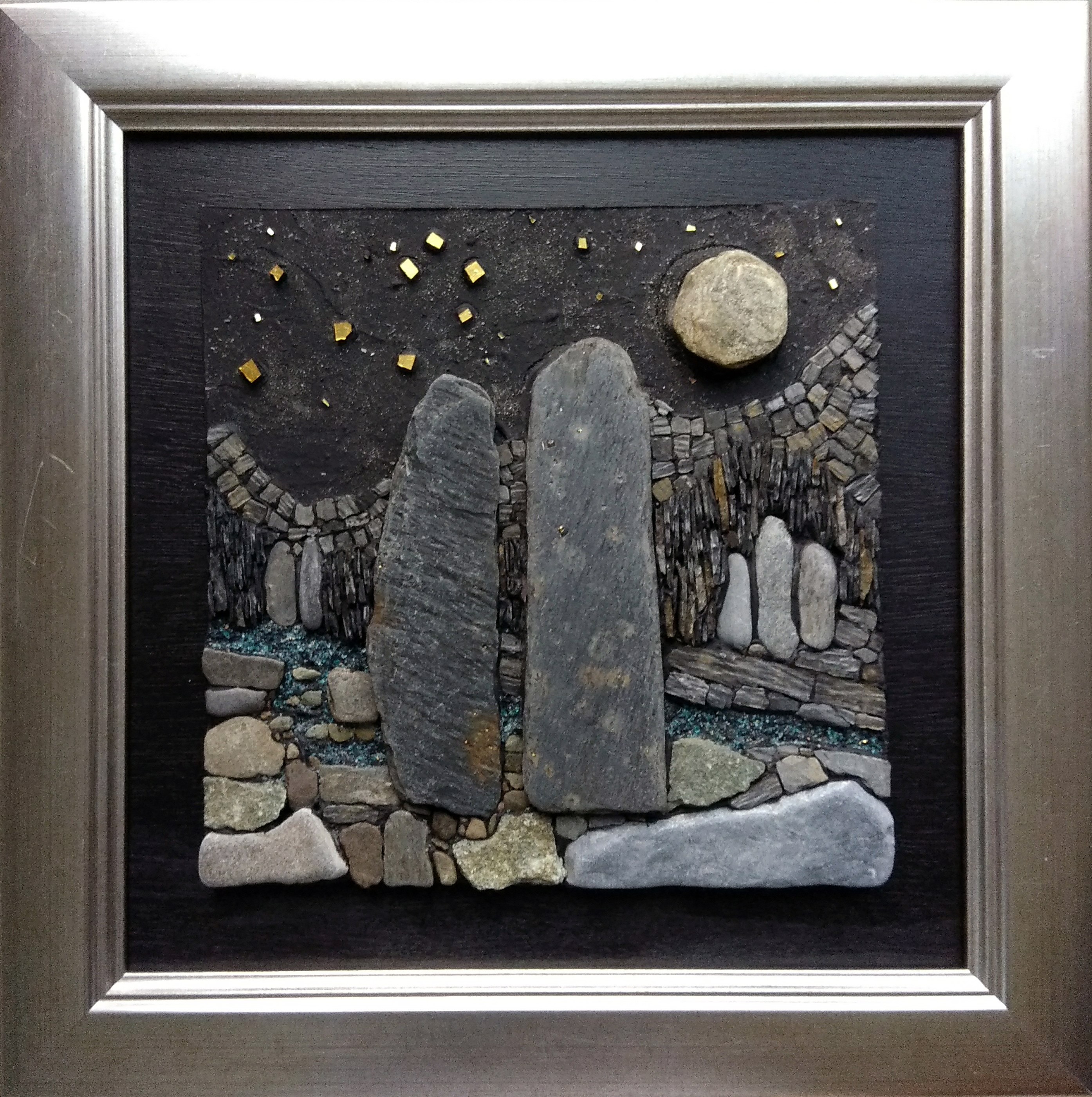 The moon, the Milky Way and major constellations link these monuments to the cosmos. Evidence is mounting that this may have been an attempt by their creators to fix time accurately through the movement of celestial bodies. In relation to artistic influences my interest in slate mosaics was sparked off many years ago when I attended a workshop run by the internationally acclaimed mosaic artist, Dougie MacInnes. His passion for geology and archaeology was infectious. Rachel Sager’s work is particularly inspiring as she involves other people in long term collaborative installations. I’ve recently joined The British Association for Modern Mosaic and this provides a wealth of information on contemporary mosaic.